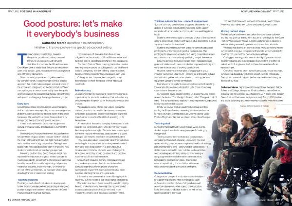 Catherine Morse , highly specialist occupational therapist , Treloar School and College , Hampshire . Email : catherine . morse @ treloar . org . ukor visit the website : www . treloar . org . uk . * Please note , the last Good Posture Week event took place in early March 2020 , before any social distancing and mask wearing measures were introduced