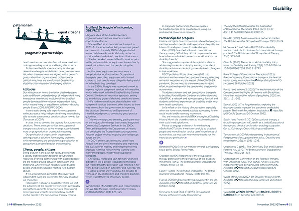 She is now retired and says for many years she did not feel like a ‘ proper ’ occupational therapist , but realised that the profession was reflected in her work , being focused on autonomy and everyday life . Maggie ’ s career shows us how it is possible to work as an ally , challenging and changing practices which restrict the lives of so many people .