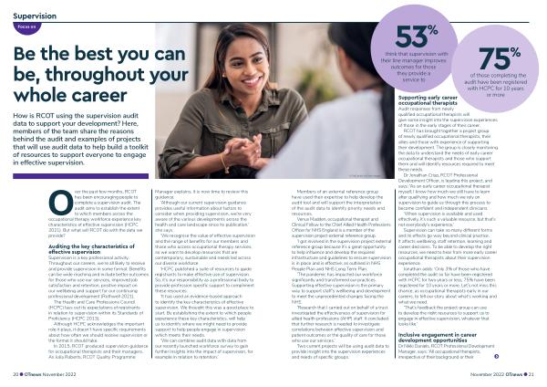ver the past few months , RCOT has been encouraging people to complete a supervision audit . The audit aims to establish the extent to which members across the occupational therapy workforce experience key characteristics of effective supervision ( HCPC 2021 ). But what will RCOT do with the data we provide ?