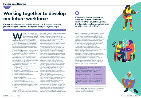 RCOT has worked with the Chartered Society of Physiotherapy ( CSP ) to jointly develop Principles of practice-based learning : Working together to develop our future workforce .