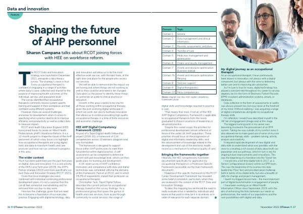 RCOT and Health Education England ( HEE ) have joined forces to create an Allied Health Professionals ( AHP ) Workforce Reform . It is a 12-month project to shape the future of the AHP personnel , of which a key focus is to highlight how occupational therapists are using digital tools and data to transform health and care provision and how we can continue to progress in this area .