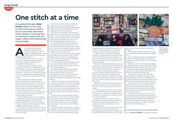 Occupational therapist Stella Daniels reflects on her Long Covid recovery journey and her use of a personally meaningful artistic medium , in the hope that by sharing her narrative she can support others both professionally and personally .