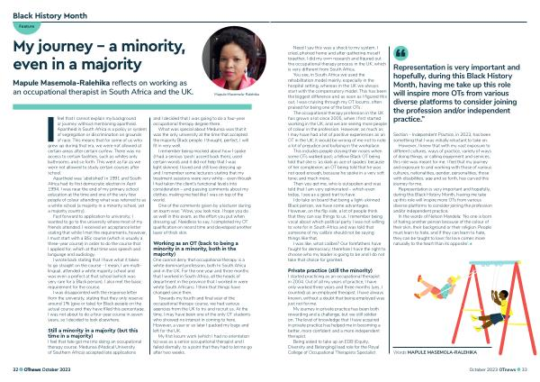 Representation is very important and hopefully , during this Black History Month , having me take up this role will inspire more OTs from various diverse platforms to consider joining the profession and / or independent practice .”