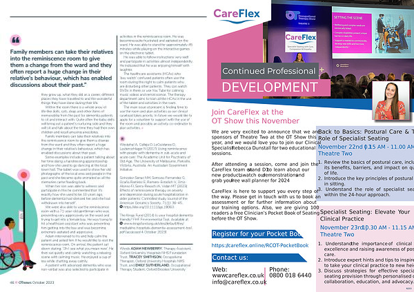 CareFlex is here to support you every step of the way . Please get in touch with us to book an assessment or for further information about our training options . Also , we are giving 100 readers a free Clinician ’ s Pocket Book of Seating before the OT Show .