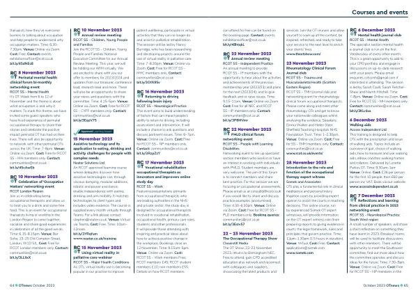 Rheumatology Clinical Forum Journal club RCOT SS – Trauma and Musculoskeletal Health ( Scottish Eastern Region ) RCOT SS – TMH journal club and networking event for rheumatology clinical forum occupational therapists . Please come along and meet other rheumatology OTs and get to know your nationwide colleagues whilst analysing the evidence . Speakers : Emma Walker and Helen Steer , Sheffield Teaching Hospitals NHS Foundation Trust . Time : 1 – 2.30pm . Venue : Online via Zoom . Cost : Free for SS – TMH members only . Contact : communities @ rcot . co . uk www . rcot . co . uk / events /