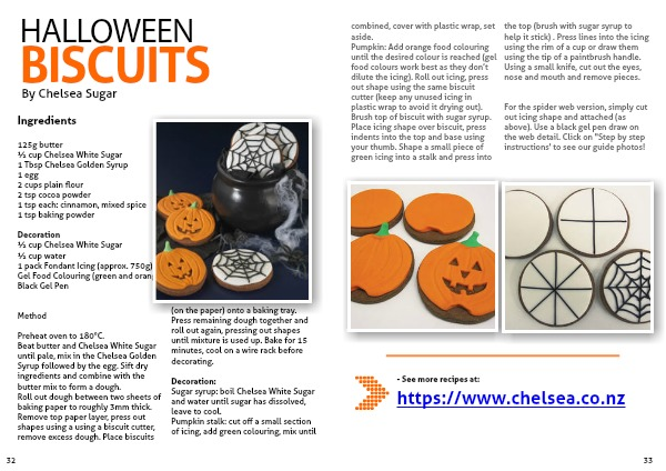 Pumpkin: Add orange food colouring until the desired colour is reached (gel food colours work best as they don’t dilute the icing). Roll out icing, press out shape using the same biscuit cutter (keep any unused icing in plastic wrap to avoid it drying out). Brush top of biscuit with sugar syrup. Place icing shape over biscuit, press indents into the top and base using your thumb. Shape a small piece of green icing into a stalk and press into the top (brush with sugar syrup to help it stick) . Press lines into the icing using the rim of a cup or draw them using the tip of a paintbrush handle. Using a small knife, cut out the eyes, nose and mouth and remove pieces.