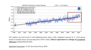 The relative sea level trend is 3.44 millimeters / year with a 95 % confidence interval of +/ - 0.19 mm / yr based on monthly mean sea level data from 1901 to 2022 . [ This ] is equivalent to a change of 1.13 feet in 100 years ( NOAA / NOS / CO-OPS )