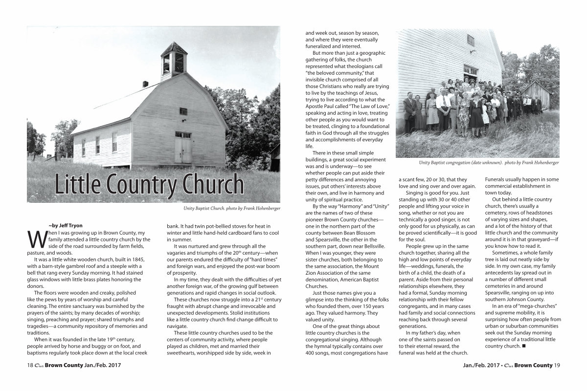 By the way“ Harmony” and“ Unity” are the names of two of these pioneer Brown County churches— one in the northern part of the county between Bean Blossom and Spearsville, the other in the southern part, down near Bellsville. When I was younger, they were sister churches, both belonging to the same association, the Mount Zion Association of the same denomination, American Baptist Churches.