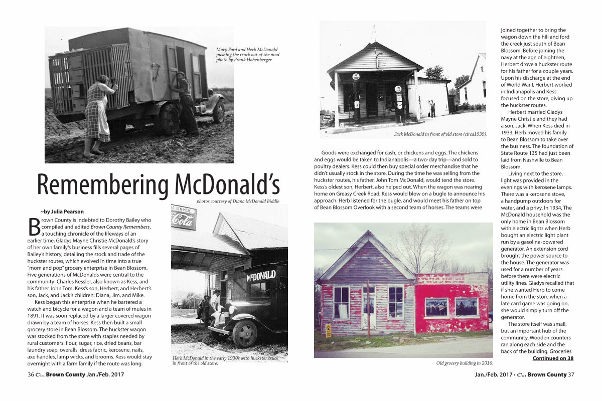 Goods were exchanged for cash, or chickens and eggs. The chickens and eggs would be taken to Indianapolis— a two-day trip— and sold to poultry dealers. Kess could then buy special order merchandise that he didn’ t usually stock in the store. During the time he was selling from the huckster routes, his father, John Tom McDonald, would tend the store. Kess’ s oldest son, Herbert, also helped out. When the wagon was nearing home on Greasy Creek Road, Kess would blow on a bugle to announce his approach. Herb listened for the bugle, and would meet his father on top of Bean Blossom Overlook with a second team of horses. The teams were