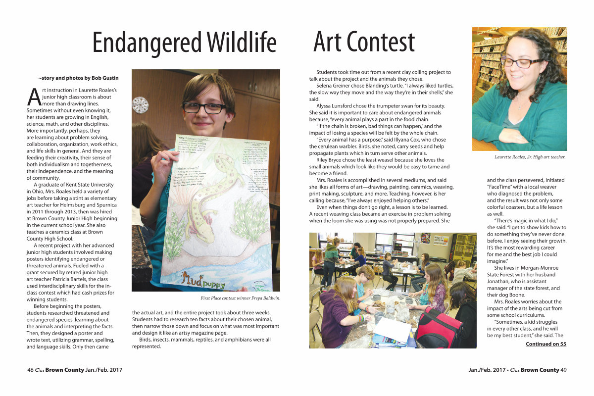 A graduate of Kent State University in Ohio, Mrs. Roales held a variety of jobs before taking a stint as elementary art teacher for Helmsburg and Spurnica in 2011 through 2013, then was hired at Brown County Junior High beginning in the current school year. She also teaches a ceramics class at Brown County High School.