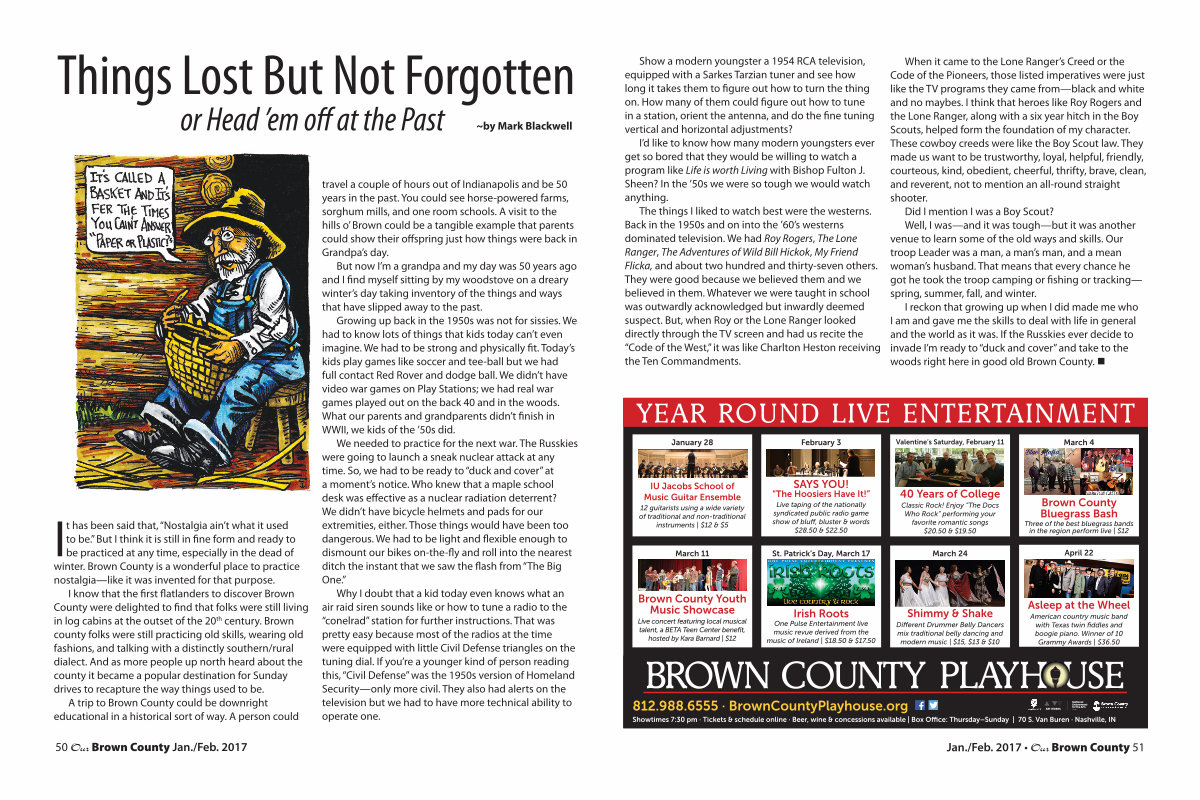 I reckon that growing up when I did made me who I am and gave me the skills to deal with life in general and the world as it was. If the Russkies ever decide to invade I’ m ready to“ duck and cover” and take to the woods right here in good old Brown County. •