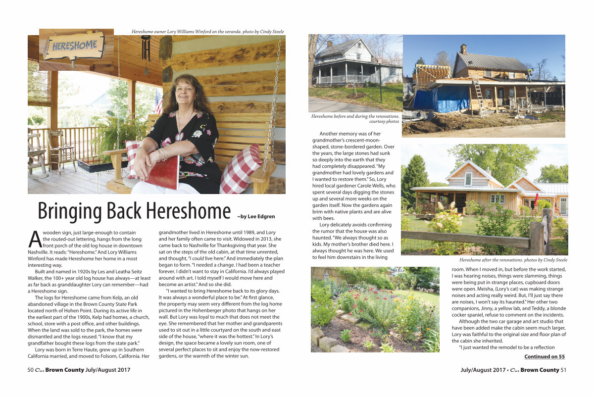 wooden sign, just large-enough to contain the routed-out lettering, hangs from the long front porch of the old log house in downtown Nashville. It reads:“ Hereshome.” And Lory Williams Winford has made Hereshome her home in a most interesting way.