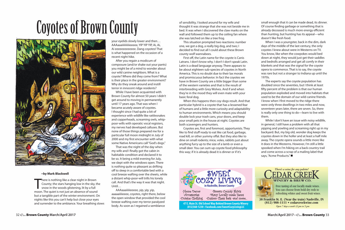 First off, the Latin name for the coyote is Canis Latrans. I don’ t know why. I don’ t I don’ t speak Latin. Latin is a dead language anyway. There appears to be about eighteen sub-species of coyotes in North America. This is no doubt due to their lax morals and promiscuous behavior. In fact the coyotes we have in Brown County are a little bigger than some of the western varieties and that is the result of interbreeding with Grey Wolves. And if and when they’ re in the mood they will even mate with your basic feral dog.