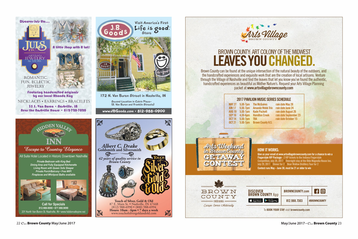 Brown County can be found at the unique intersection of the natural beauty of the outdoors, and the handcrafted experiences and exquisite work that are the creation of local artisans. Venture through the Village of Nashville and find the leaves that let you know you’ ve found the authentic, handcrafted experiences as beautiful as Mother Nature’ s. Request your Arts Village Planning packet at www. artsvillagebrowncounty. com