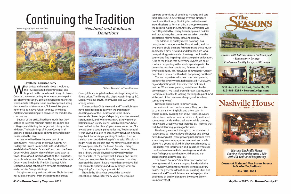 Current artists Chris Newlund and Thom Robinson have each decided to carry on the tradition of donating one of their best works to the library. Newlund’ s“ Sweet Legacy,” depicting a horse-powered sorghum mill, and“ Winter Warmth,” a snow scene at Kelp’ s farm on Greasy Creek Road by Robinson, have been added to the library’ s permanent collection.“ It’ s always been a special painting for me,” Robinson said.“ I was saving it to give to somebody.” Newlund similarly kept back her nostalgic painting.“ I had put it up for sale but then decided to keep it,” she said.“ If I sold it I might never see it again and my family wouldn’ t see it. It’ s so appropriate for the Brown County Library.”