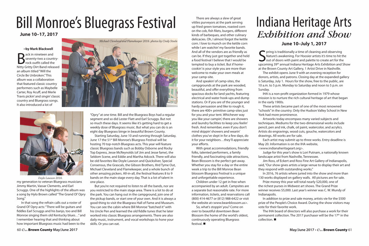 Spring is traditionally a time of cleaning and observing Nature’ s awakening. For Hoosier artists it’ s time to hit the out of doors with paint and palette to create art for the upcoming 39 th annual Indiana Heritage Arts Exhibition and Show at the Brown County Art Gallery, 1 Artist Drive in Nashville.