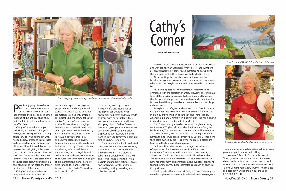 For 13 years, Cathy stayed at home tending her growing family— sons Whylee, Bill, and Jake. The first store Cathy and her husband, Tom, owned and operated was in Bloomington and dealt primarily in used furniture. Combining both their names, the store was called Tomcat Alley. Cathy’ s Corner is the third store owned by the Haggertys. Their re-sale stores are located in Bedford and Bloomington.