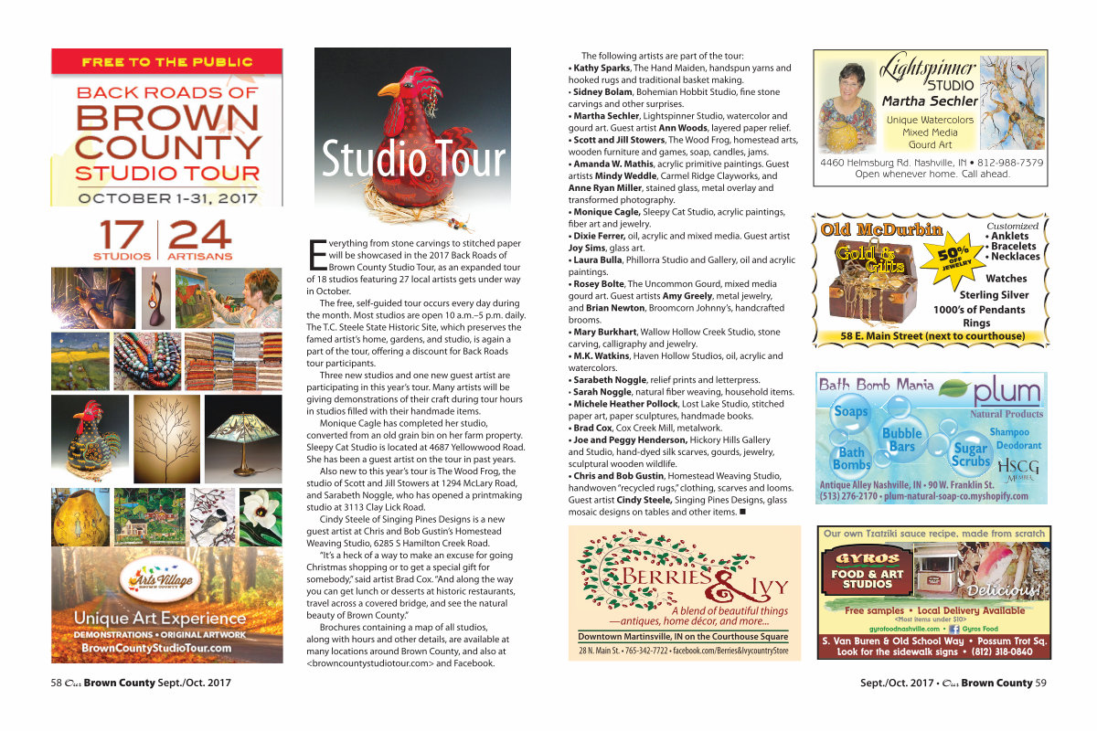 Brochures containing a map of all studios, along with hours and other details, are available at many locations around Brown County, and also at < browncountystudiotour. com > and Facebook.