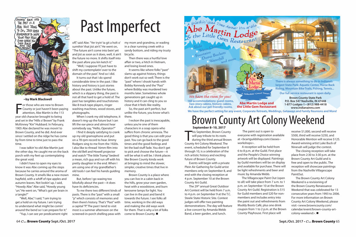 Brown County is a place where you can live in a cabin back in the hills, grow your own garden, heat with a woodstove, and burn kerosene lamps for light. You can live in the past and bend it towards the future. I see folks all time, working in the old ways and making the old ways work for them. That is why a lot of folks come to Brown County. •