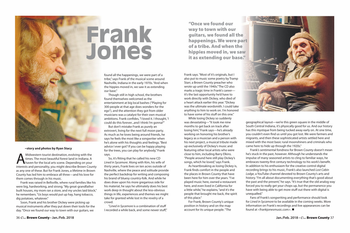 Midwestern tourist destination, evolving with the times. The most beautiful forest land in Indiana. A haven for the local arts scene. Depending on your interests and personality, you might describe Brown County as any one of these. But for Frank Jones, a lifetime in Brown County has led him to embrace all three— and his love for them comes through in his music.