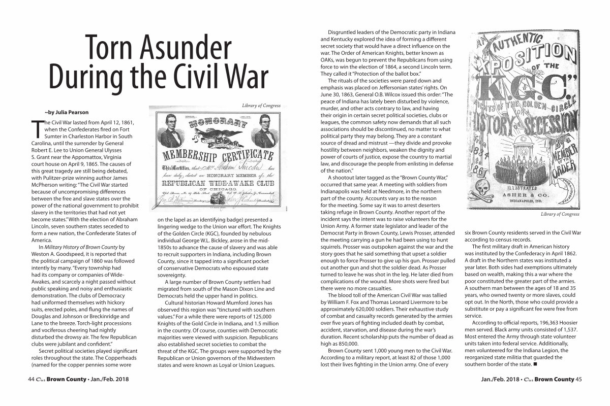 on the lapel as an identifying badge) presented a lingering wedge to the Union war effort. The Knights of the Golden Circle( KGC), founded by nebulous individual George W. L. Bickley, arose in the mid- 1850s to advance the cause of slavery and was able to recruit supporters in Indiana, including Brown County, since it tapped into a significant pocket of conservative Democrats who espoused state sovereignty.