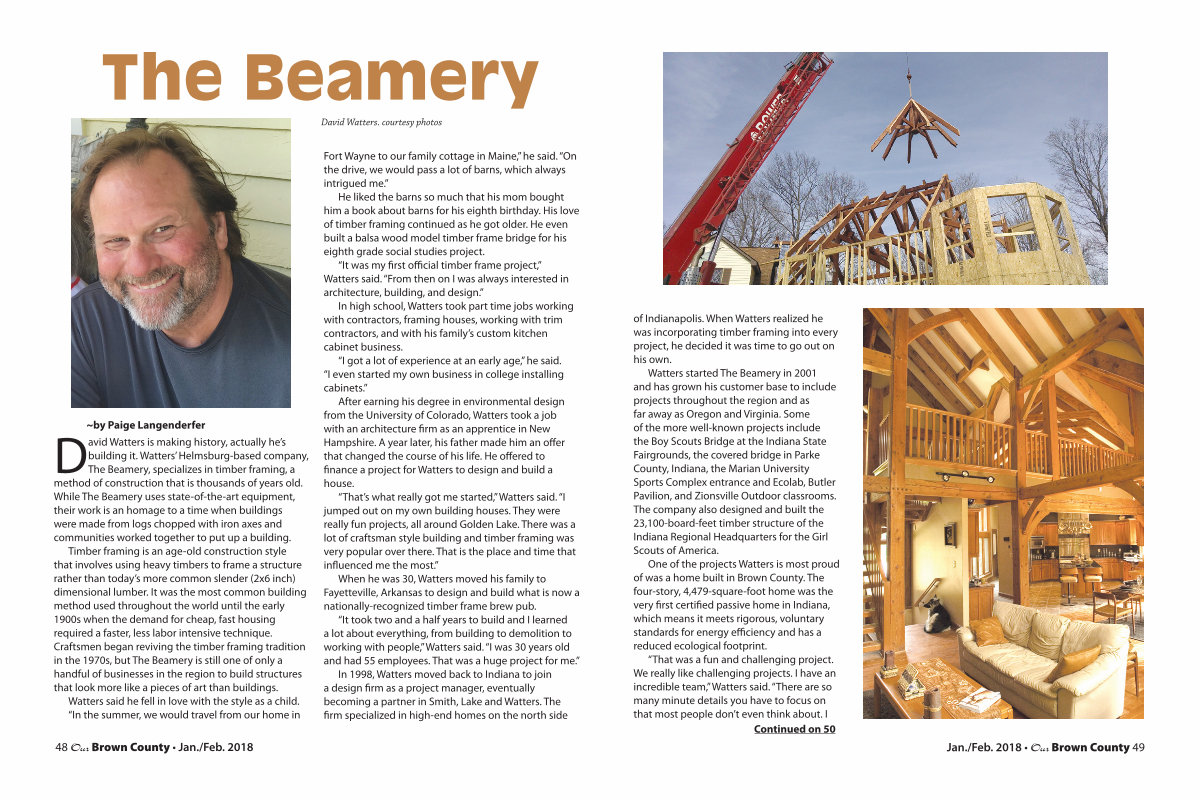 Watters started The Beamery in 2001 and has grown his customer base to include projects throughout the region and as far away as Oregon and Virginia. Some of the more well-known projects include the Boy Scouts Bridge at the Indiana State Fairgrounds, the covered bridge in Parke County, Indiana, the Marian University Sports Complex entrance and Ecolab, Butler Pavilion, and Zionsville Outdoor classrooms. The company also designed and built the 23,100-board-feet timber structure of the Indiana Regional Headquarters for the Girl Scouts of America.