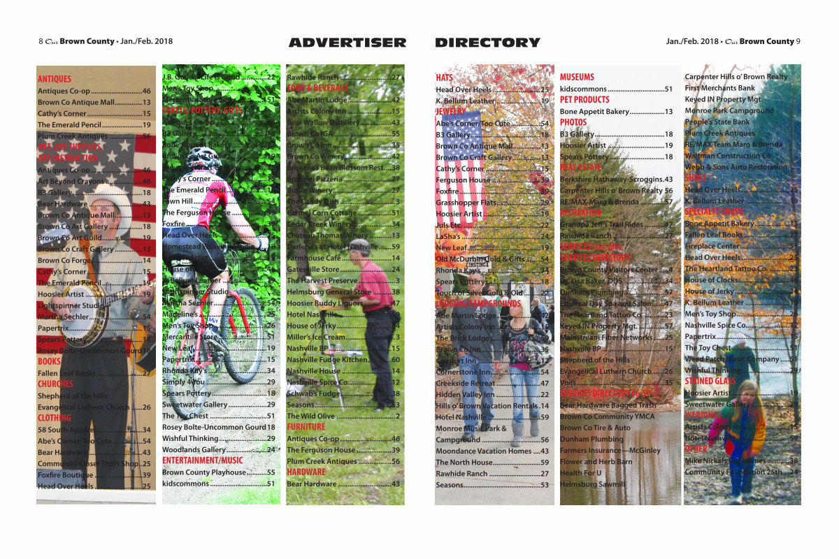 Abe’ s Corner / Too Cute................. 54 B3 Gallery....................................... 18 Brown Co Antique Mall................ 13 Brown Co Craft Gallery................ 13 Cathy’ s Corner............................... 15 Ferguson House............................ 39 Foxfire............................................. 39 Grasshopper Flats......................... 29 Hoosier Artist................................ 19 Juls Etc............................................ 22 LaSha’ s............................................ 24 New Leaf......................................... 19 Old McDurbin Gold & Gifts......... 54 Rhonda Kay’ s................................. 34 Spears Pottery............................... 18