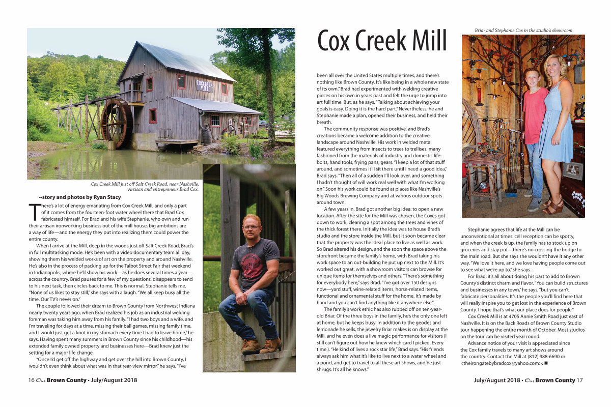 Advance notice of your visit is appreciated since the Cox family travels to many art shows around the country. Contact the Mill at( 812) 988-6690 or < theirongatebybradcox @ yahoo. com >. •