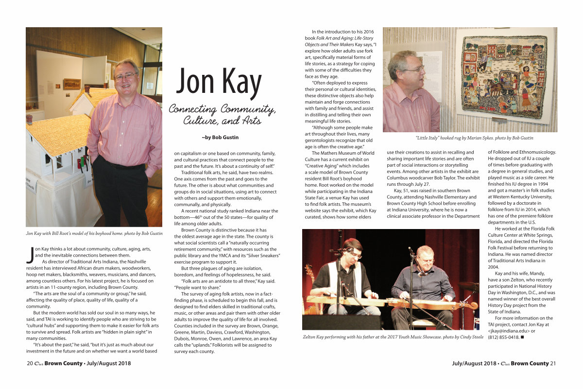 As director of Traditional Arts Indiana, the Nashville resident has interviewed African drum makers, woodworkers, hoop net makers, blacksmiths, weavers, musicians, and dancers, among countless others. For his latest project, he is focused on artists in an 11-county region, including Brown County.