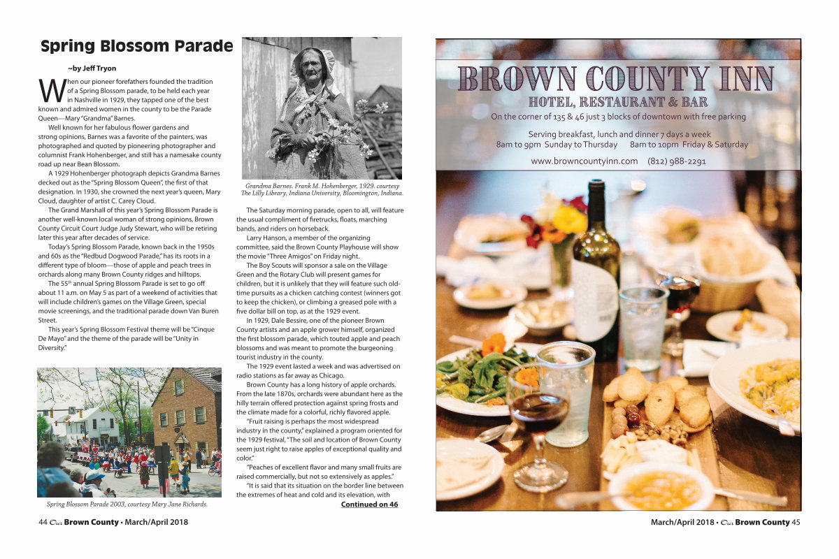 Today’ s Spring Blossom Parade, known back in the 1950s and 60s as the“ Redbud Dogwood Parade,” has its roots in a different type of bloom— those of apple and peach trees in orchards along many Brown County ridges and hilltops.