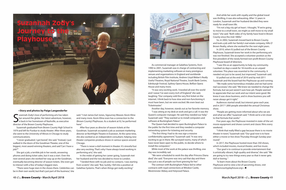 To learn more about the Brown County Playhouse and to view a list of upcoming shows, visit < browncountyplayhouse. org >. •