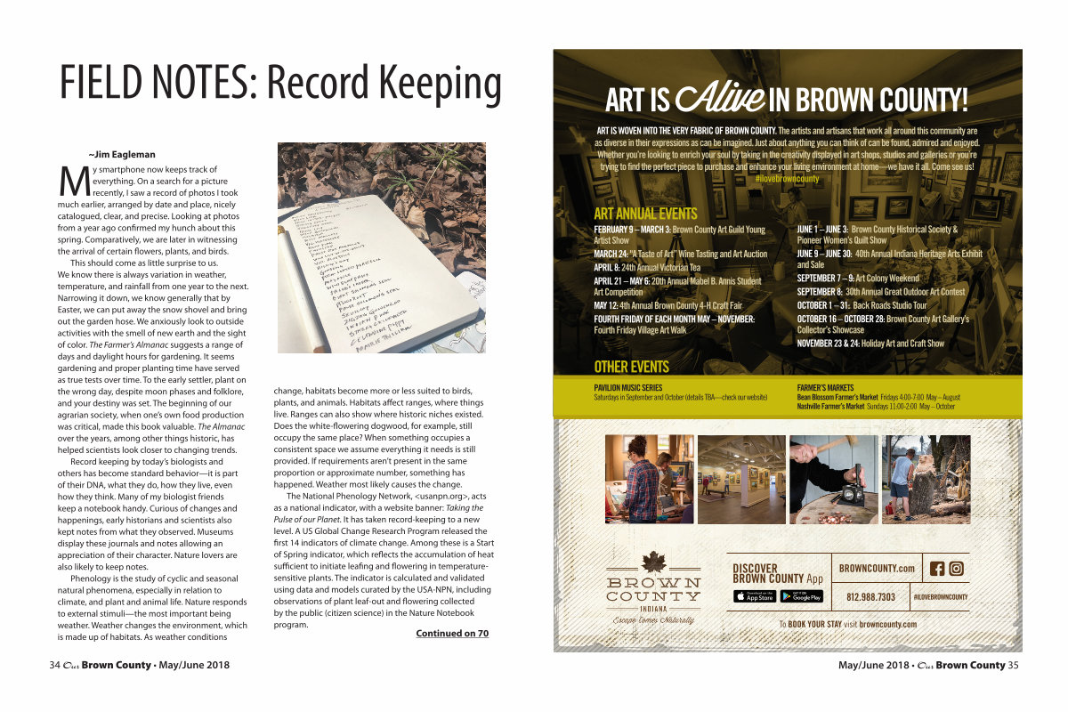ART IS WOVEN INTO THE VERY FABRIC OF BROWN COUNTY. The artists and artisans that work all around this community are as diverse in their expressions as can be imagined. Just about anything you can think of can be found, admired and enjoyed. Whether you’ re looking to enrich your soul by taking in the creativity displayed in art shops, studios and galleries or you’ re trying to find the perfect piece to purchase and enhance your living environment at home— we have it all. Come see us! # ilovebrowncounty