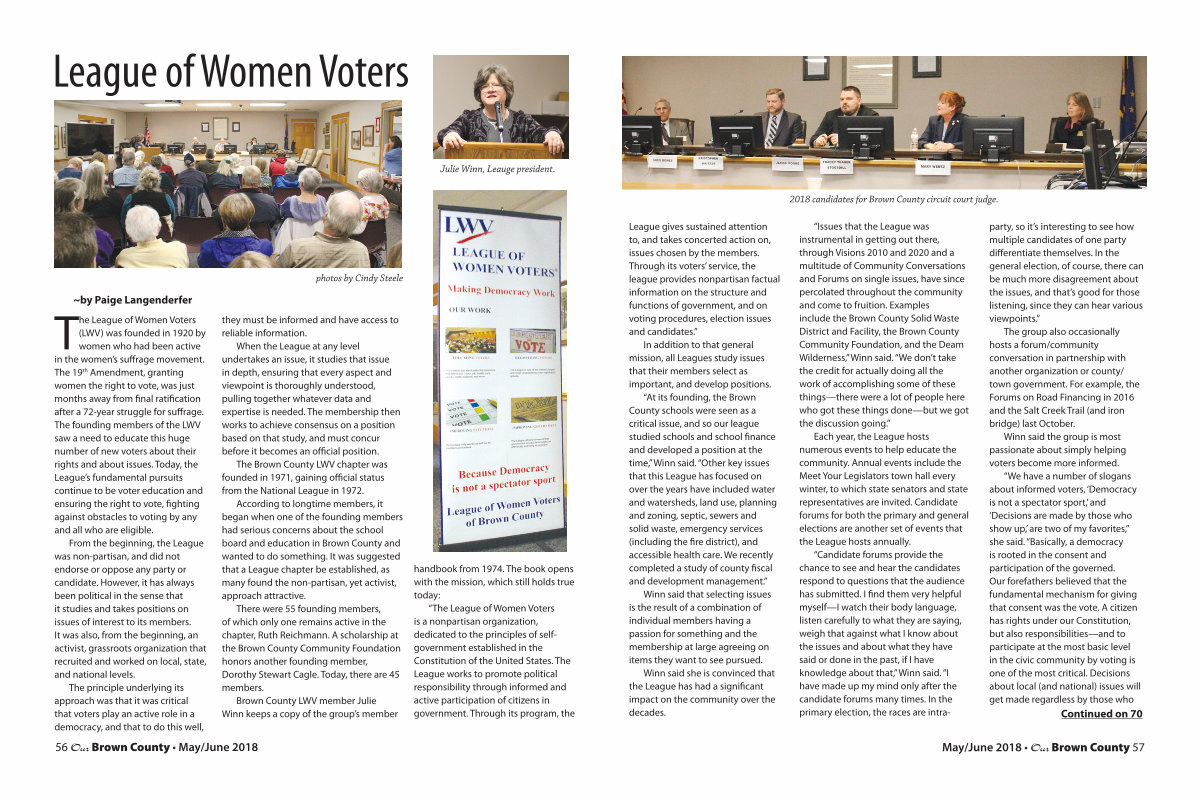The Brown County LWV chapter was founded in 1971, gaining official status from the National League in 1972.