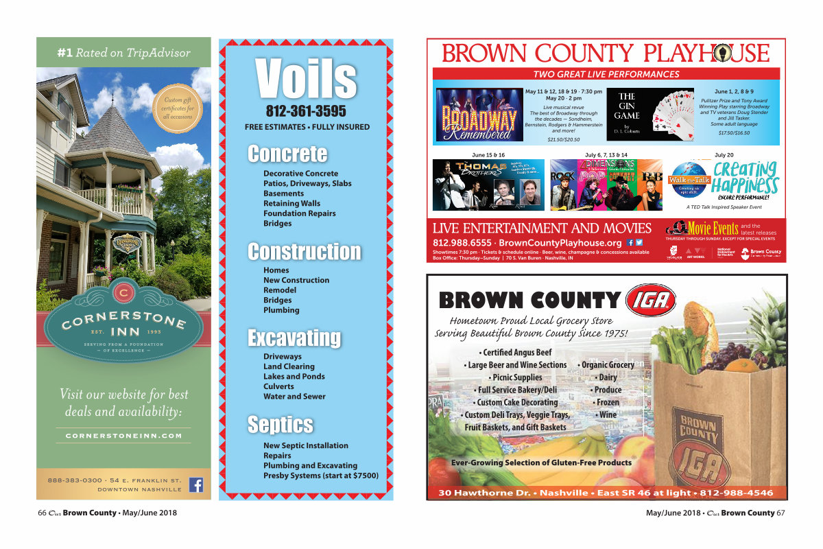 30 Hawthorne Dr. • Nashville • East SR 46 at light • 812-988-4546 May / June 2018 • Our Brown County 67