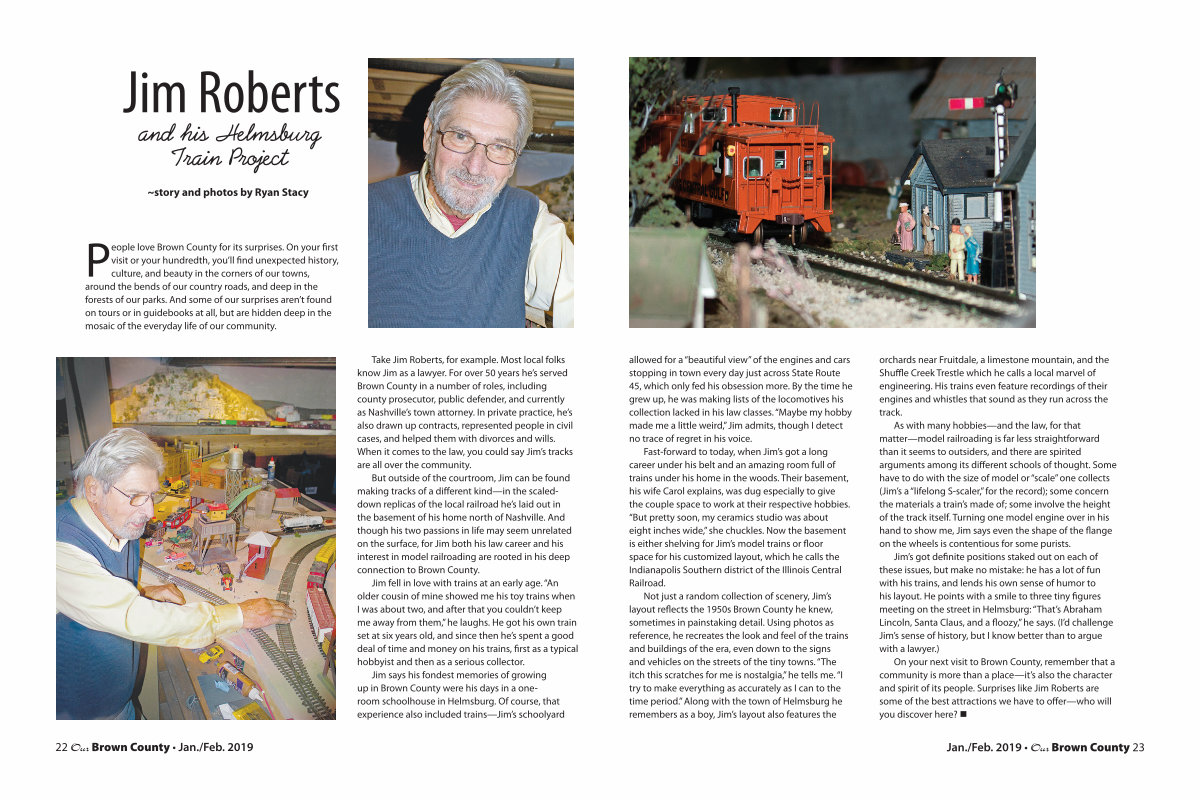 On your next visit to Brown County, remember that a community is more than a place— it’ s also the character and spirit of its people. Surprises like Jim Roberts are some of the best attractions we have to offer— who will you discover here? •