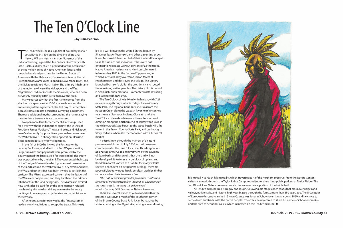 The Ten O’ clock Line is 16 miles in length, with 7.29 miles passing through what is today’ s Brown County State Park. The regional boundary line runs from the Raccoon Creek along the Wabash River near Vincennes to a site near Seymour, Indiana. Close at hand, the Ten O’ clock Line extends in a northwest to southeast direction along the northern end of Yellowwood Lake in the Yellowwood State Forest to the Weed Patch Hill’ s fire tower in the Brown County State Park, and on through Story, Indiana, where it is memorialized with a historical marker.