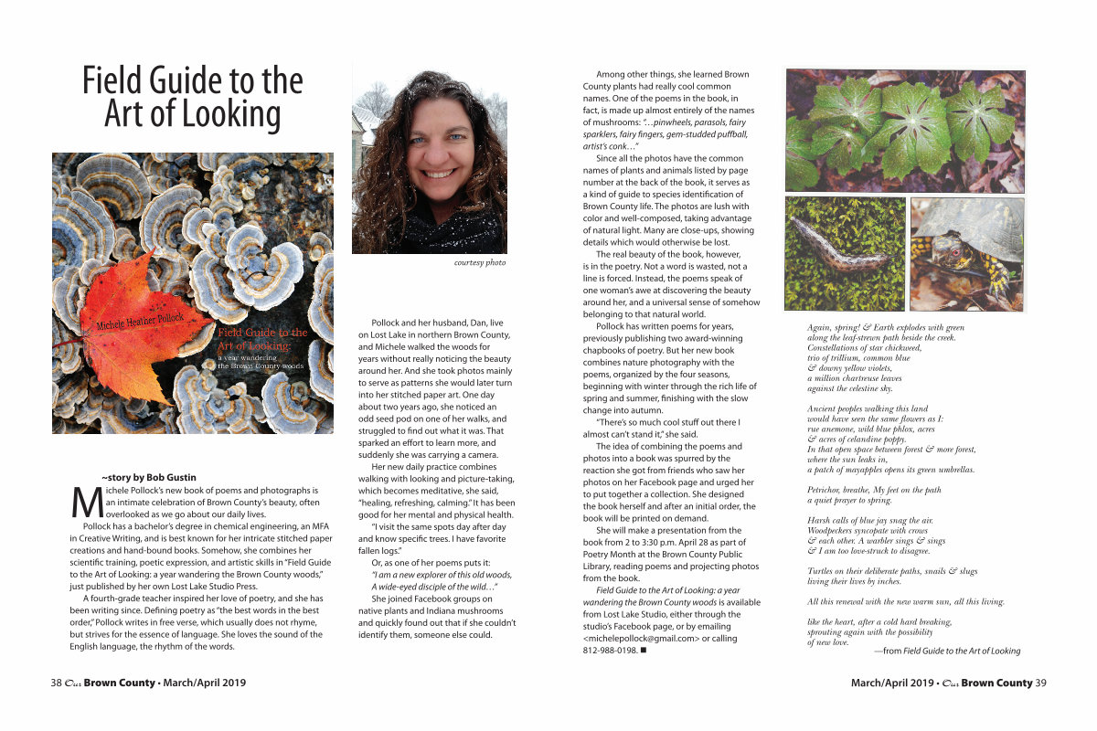 Pollock has a bachelor’ s degree in chemical engineering, an MFA in Creative Writing, and is best known for her intricate stitched paper creations and hand-bound books. Somehow, she combines her scientific training, poetic expression, and artistic skills in“ Field Guide to the Art of Looking: a year wandering the Brown County woods,” just published by her own Lost Lake Studio Press.