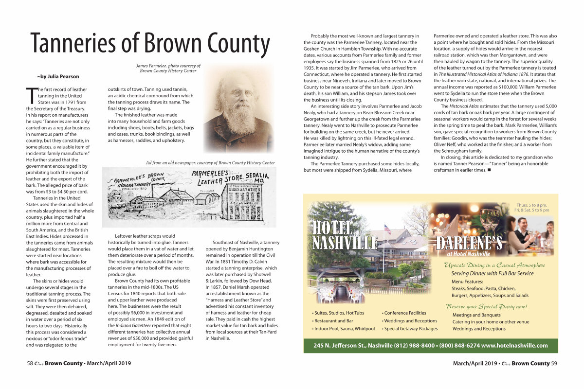 Brown County had its own profitable tanneries in the mid-1800s. The US Census for 1840 reports that both sole and upper leather were produced here. The businesses were the result of possibly $ 6,000 in investment and employed six men. An 1849 edition of the Indiana Gazetteer reported that eight different tanneries had collective annual revenues of $ 50,000 and provided gainful employment for twenty-five men.