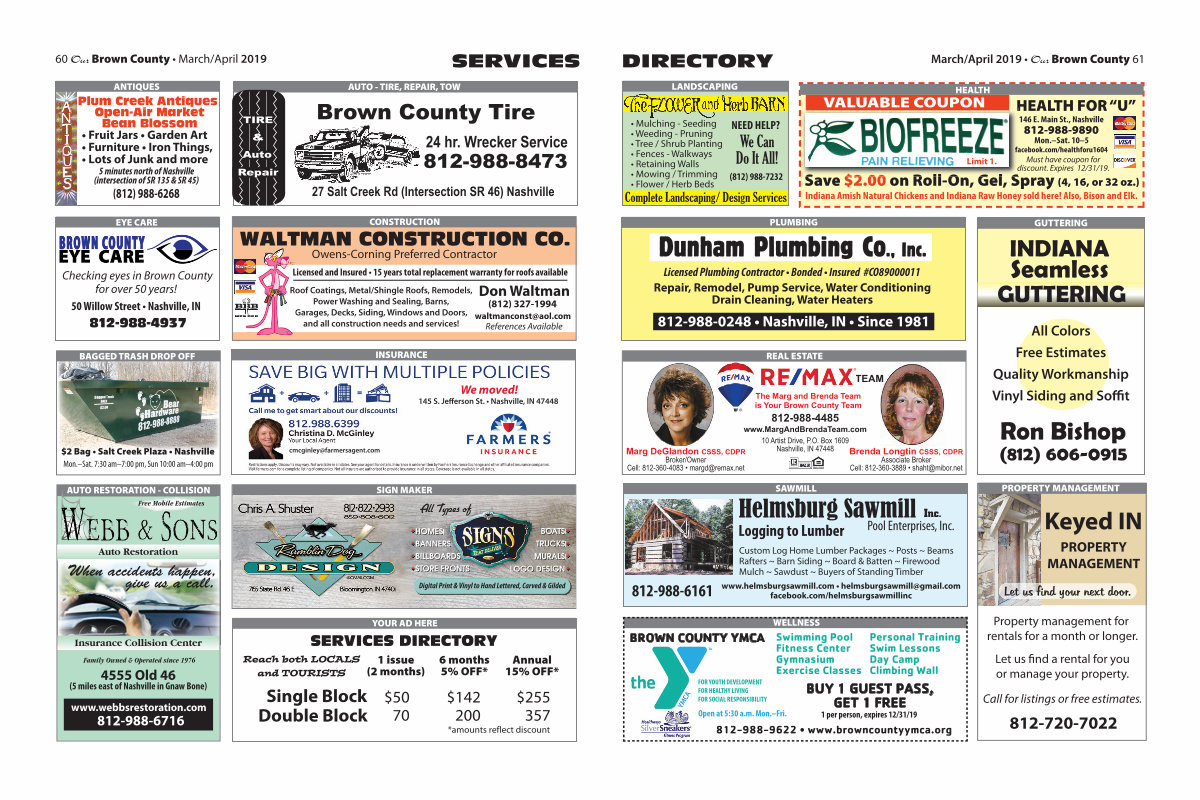 60 Our Brown County • March / April 2019 AUTO- TIRE, REPAIR, TOW TIRE Auto Repair & 24 hr. Wrecker Service 812-988-8473 27 Salt Creek Rd( Intersection SR 46) Nashville Brown County Tire CONSTRUCTION WALTMAN CONSTRUCTION CO. Owens-Corning Preferred Contractor Licensed and Insured • 15 years total replacement warranty for roofs available Roof Coatings, Metal / Shingle Roofs, Remodels, Power Washing and Sealing, Barns, Garages, Decks, Siding, Windows and Doors, and all construction needs and services! L Ro G Don Waltman( 812) 327-1994 waltmanconst @ aol. com References Available AUTO RESTORATION- COLLISION AUTO RESTORATION- COLLISION 4555 Old 46( 5 miles east of Nashville in Gnaw Bone) When accidents happen, Auto Restoration Insurance Collision Center Family Owned & Operated since 1976 give us a call. 812-988-6716 www. webbsrestoration. com Free Mobile Estimates INSURANCE We moved! 145 S. Jefferson St. • Nashville, IN 47448 cmcginley @ farmersagent. com BAGGED TRASH DROP OFF $ 2 Bag • Salt Creek Plaza • Nashville Mon.– Sat. 7:30 am – 7:00 pm, Sun 10:00 am – 4:00 pm SERVICES EYE CARE Checking eyes in Brown County for over 50 years! 50 Willow Street • Nashville, IN 812-988-4937 SIGN MAKER HOM HOM HOM HOM OM O HO HOM OM HOM HO ES ES ES ES ES ES ES HOMES N BAN BAN BAN BA BAN BAN BAN BAN AN AN A NER NER NER ER ER NE NE NER E NER NER N R E S BANNERS IL IL BIL BIL BIL IL IL BI B LLBO LBO LBO LB LBO LBO LBO LB ARD ARD ARD ARD ARD RD ARD RD R ARD AR ARD ARD ARD AR AR S BILLBOARDS STO STO STO STO TO STO TO STO TO STO STO T STORE RE RE RE RE RE RE RE FRO FRO FRO FR FRO FRO R FRO R FR FR FR NTS NT NTS NTS NTS NTS NTS TS NTS TS NTS NTS NTS TS NTS TS NTS NT NTS NTS STORE FRONTS BOA BOA BOA BOA BOA BOA BOA BOA OA BOA BOA O BOATS TS TS TS TS TS TS TS TS TS TS TS TS BOATS TRU TRU TRU TRU TRU TRU R TR TR TRU TRU RU RU R TR TR TR TRU T CKS CKS CKS CKS CKS KS CKS CKS KS CKS KS KS CKS KS CK TRUCKS MUR MUR MUR MUR MUR MUR MUR MUR MUR MU MU MUR MU M R U ALS ALS ALS ALS ALS ALS LS ALS ALS ALS LS LS A S MURALS LOG LO LOG LOG LOG LOG LOG OG O LOG LOG LOG OG LOG LOG LOG LO LOG LOG LOG OG LO LO LO LO LO LO LO LO O D O D OD O D O D OD OD OD OD OD OD OD OD O D O D O DESI ESI ESI ESI ESI ESI ESI S ESI ESI ESI S ES ES ESI ESI ESI ES ES GN GN GN GN GN GN GN GN GN GN GN GN GN GN GN GN GN G LOGO DESIGN All Types of Digital Print & Vinyl to Hand Lettered, Carved & Gilded ANTIQUES Plum Creek Antiques Open-Air Market Bean Blossom 5 minutes north of Nashville( intersection of SR 135 & SR 45) • Fruit Jars • Garden Art • Furniture • Iron Things, • Lots of Junk and more( 812) 988-6268 YOUR AD HERE 1 issue( 2 months) 6 months 5 % OFF * Annual 15 % OFF * $ 50 $ 142 $ 255 70 200 357 Single Block Double Block * amounts reflect discount Reach both LOCALS and TOURISTS SERVICES DIRECTORY
