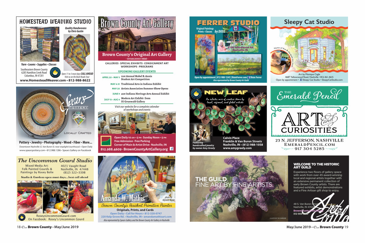 Originals, Prints, and Cards Open Daily • Call for Hours • 812-320-0747 220 Kelp Grove Rd. • Nashville, IN • amandamathisart. com Also represented by Spears Gallery and the Brown County Art Gallery in Nashville