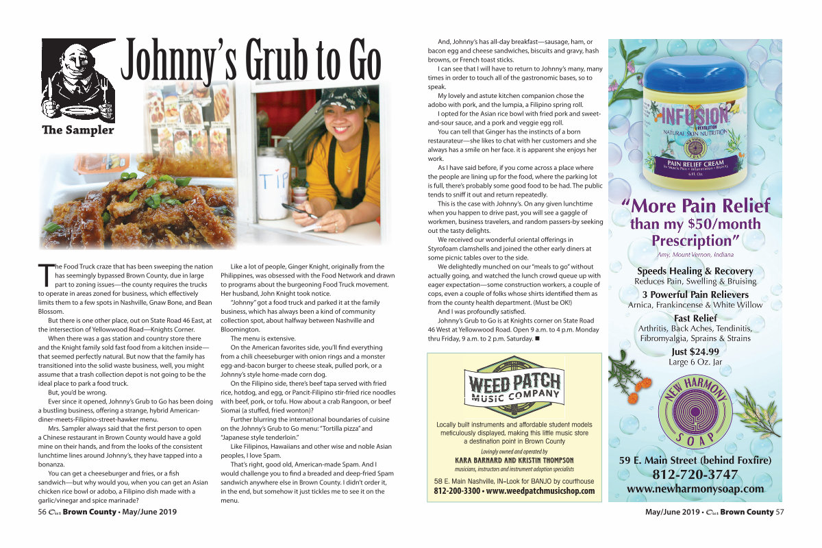 We delightedly munched on our“ meals to go” without actually going, and watched the lunch crowd queue up with eager expectation— some construction workers, a couple of cops, even a couple of folks whose shirts identified them as from the county health department.( Must be OK!) And I was profoundly satisfied. Johnny’ s Grub to Go is at Knights corner on State Road 46 West at Yellowwood Road. Open 9 a. m. to 4 p. m. Monday thru Friday, 9 a. m. to 2 p. m. Saturday. •