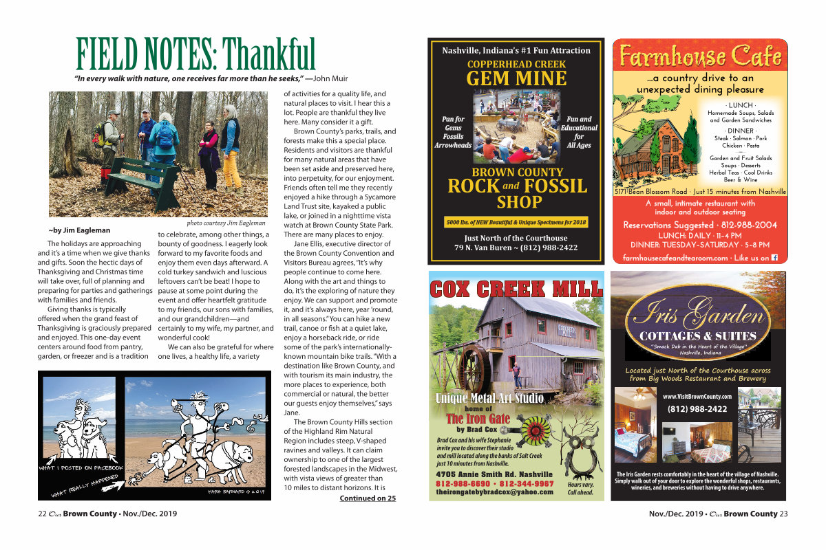 Brown County’ s parks, trails, and forests make this a special place. Residents and visitors are thankful for many natural areas that have been set aside and preserved here, into perpetuity, for our enjoyment. Friends often tell me they recently enjoyed a hike through a Sycamore Land Trust site, kayaked a public lake, or joined in a nighttime vista watch at Brown County State Park. There are many places to enjoy.
