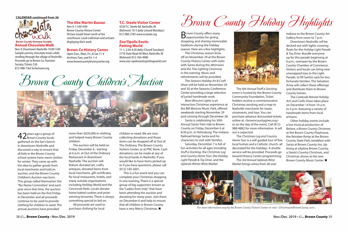 Nov. 9, Downtown Nashville 10:00-5:00 Sample yummy chocolate treats while strolling through the village of Nashville. Proceeds go to Brown Co. Humane Society. Tickets $ 30 812-988-7362 bchumane. org