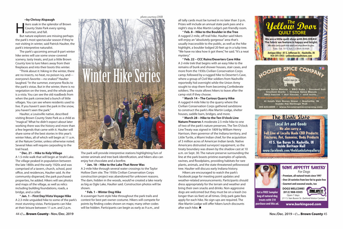 The park’ s upcoming annual 8-part winter hike series will use some snow-covered scenery, tasty treats, and just a little Brown County lore to lure hikers away from their fireplaces and into their boots this winter.