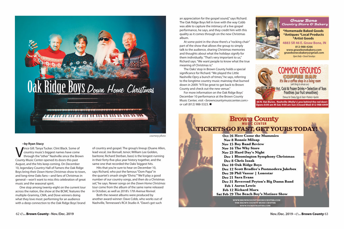 Vince Gill. Tanya Tucker. Clint Black. Some of country music’ s biggest names have come through the“ other” Nashville since the Brown County Music Center opened its doors this past August, and the hits keep coming. On December 10, legendary Country Hall of Famers the Oak Ridge Boys bring their Down Home Christmas show to town, and long-time Oaks fans— and fans of Christmas in general— won’ t want to miss this celebration of great music and the seasonal spirit.