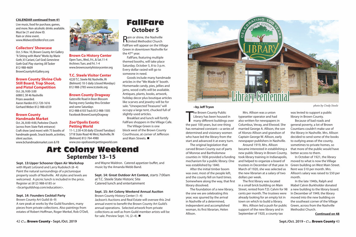 Sept. 15: Art Colony Weekend Annual Auction Brown County History Center( 1 – 4) Jackson’ s Auctions and Real Estate will oversee this 2nd annual event to benefit the Brown County Art Guild’ s annual operations. Selected artwork from private collections as well as from Guild member artists will be for sale. Preview Sept. 14,( 2 – 4). •