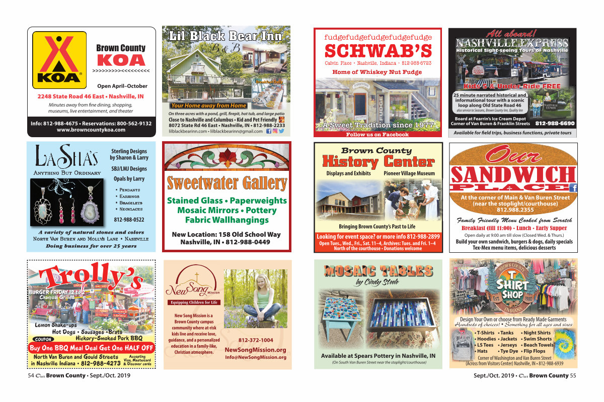 Sept./ Oct. 2019 • Our Brown County 55 Design Your Own or choose from Ready Made Garments Hundreds of choices! • Something for all ages and sizes • Tanks • Jackets • Jerseys • Tye Dye • T-Shirts • Hoodies • LS Tees • Hats • Night Shirts • Swim Shorts • Beach Towels • Flip Flops Corner of Washington and Van Buren Street( Across from Visitors Center) Nashville, IN • 812-988-6939 NASHVILLE EXPRESS NASHVILLE EXPRESS All aboard! Kids 5 & Under Ride FREE Board at Fearrin’ s Ice Cream Depot Corner of Van Buren & Franklin Streets 25 minute narrated historical and informational tour with a scenic loop along Old State Road 46 Available for field trips, business functions, private tours 812-988-6690 Hi Hi Hi Hi Hi Hi Hi Hi Hi Hi Hi Hi Hi Hi H st st st st st st st st st st st st st st st st st st st st st st st st st st st st st st st st st st st st st st st st stor or or or or or or or or or or or or or or or or or or o ic ic ic ic ic ic ic ic ic ic ic ic ic ic ic ic ic ic ical al al al al al al al al al al al al al al al al al al al a Sig ig ig ig ig ig ig ig ig ig ig ig ig ight ht ht ht ht ht ht ht ht ht ht ht ht ht ht ht ht ht ht ht ht ht ht ht ht ht ht ht ht ht ht ht ht ht ht ht ht ht ht ht ht ht ht ht ht ht ht ht ht ht ht ht ht ht ht ht ht ht ht ht ht-s-s-s-s-s-s-s-s-s-s-s-s-s-s-s-s-s-s-s-s-s-s-s-s-s-s-s-see ee ee ee ee ee ee ee ee ee ee ee ee ee ee ee ee ee ee ee ee ee ee ee ee ee ee ee ee ee ee ee ee ee ee ee e in in in in in in in in in in in in in in in in in in in in in in in in in in in in in in in ing To To To To To To To To To To To To To To To To To To To To To To To To To To To To To To To To To To To To To To To To To To To To To To To To To To To To To To To To To To Tour ur ur ur ur ur ur ur ur ur ur ur ur ur ur ur ur ur ur ur ur ur ur ur urs of of of of of of of of of of of of of of of of of of of of of of of of of of of of of of of of of of of of of of of of of of of of of of of of of of of of of of of of of of of of of of of of of of of of of of of of of of of of of of of of of of of of of of of of of of of of of of Nas as as as as as as as as as as as as as as as as as as as as as as as as as as as as as as as as as as as as as as as as as as as as as as as as as as as as as as as as as as as as as as as as as as as as as as as as as as ashv hv hv hv hv hv hv hv hv hv hv hv hv hv hv hv hv hv hv hv hv hv hv hv hv hv hv hv hv hv hv hv hv hv hv hv hv hv hv hv hv hv hv hv hv hv hv hv hv hv hv hv hv hv hv hv hv hv hv hv hv hv hv hv hv hv hv hv hv hv hv hv hv hv hv hvil il il il il il il il il il il il il il il il il il il il il il il il il il il il il il il il il il il il il il il il il il il il il il il il il il il il il il il il il il il il il il il il il il il il il il il il il il il il il il il il i le le le le le le le le le le le le le le le le le le le le le le le le le le le le le le le le le le le le le le le le Historical Sight-seeing Tours of Nashville also service to Seasons, Brown County Inn, Quality Inn Brown County History Center Open Tues., Wed., Fri., Sat. 11 – 4, Archives: Tues. and Fri. 1 – 4 North of the courthouse • Donations welcome Pioneer Village Museum Bringing Brown County’ s Past to Life Displays and Exhibits Looking for event space? or more info 812-988-2899 SANDWICH At the corner of Main & Van Buren Street( near the stoplight / courthouse) 812.988.2355 PLACE Family Friendly Menu Cooked from Scratch Breakfast( till 11:00) • Lunch • Early Supper Open daily at 9:00 am till slow( Closed Wed. & Thurs.) Our Build your own sandwich, burgers & dogs, daily specials Tex-Mex menu items, delicious desserts by Cindy Steele Available at Spears Pottery in Nashville, IN( On South Van Buren Street near the stoplight / courthouse)
