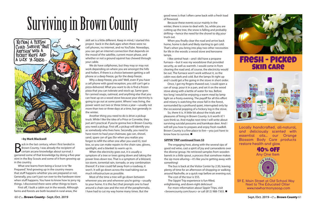 Back in the last century, when I first landed in Brown County, I was already the recipient of certain arcane knowledge about survival. I garnered some of that knowledge by doing a five-year stint in the Boy Scouts and some of it from growing up in the country.