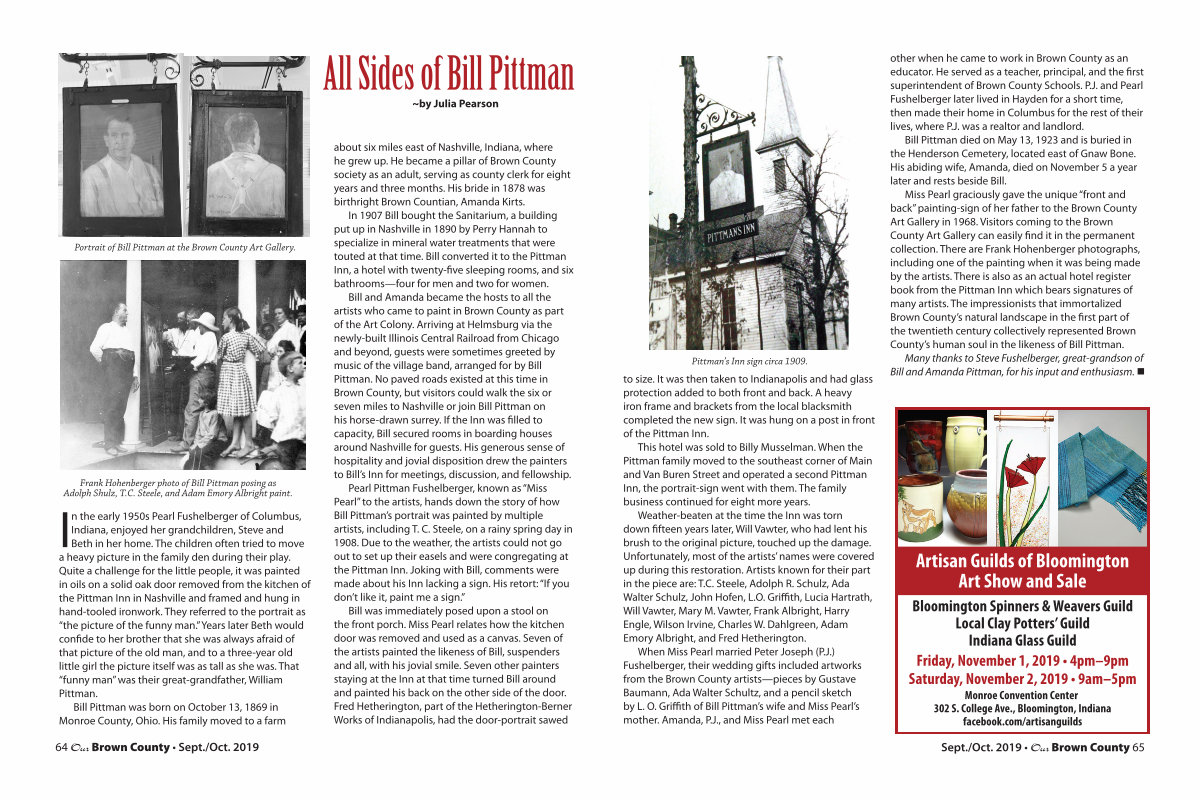 Miss Pearl graciously gave the unique“ front and back” painting-sign of her father to the Brown County Art Gallery in 1968. Visitors coming to the Brown County Art Gallery can easily find it in the permanent collection. There are Frank Hohenberger photographs, including one of the painting when it was being made by the artists. There is also as an actual hotel register book from the Pittman Inn which bears signatures of many artists. The impressionists that immortalized Brown County’ s natural landscape in the first part of the twentieth century collectively represented Brown County’ s human soul in the likeness of Bill Pittman.