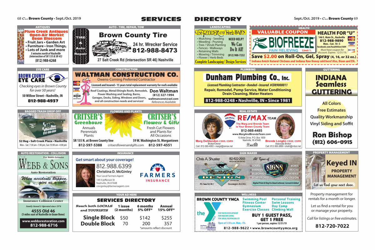 Sept./ Oct. 2019 • Our Brown County 69 LANDSCAPING • Mulching- Seeding • Weeding- Pruning • Tree / Shrub Planting • Fences- Walkways • Retaining Walls • Mowing / Trimming • Flower / Herb Beds We Can Do It All!( 812) 988-7232 NEED HELP? Complete Landscaping / Design Services WELLNESS 812-988-9622 • www. browncountyymca. org FOR YOUTH DEVELOPMENT FOR HEALTHY LIVING FOR SOCIAL RESPONSIBILITY BROWN COUNTY YMCA Open at 5:30 a. m. Mon.– Fri. Swimming Pool Fitness Center Gymnasium Exercise Classes Personal Training Swim Lessons Day Camp Climbing Wall BUY 1 GUEST PASS, GET 1 FREE 1 per person, expires 12 / 31 / 19 HEALTH Save $ 2.00 on Roll-On, Gel, Spray( 4, 16, or 32 oz.) HEALTH FOR“ U” Indiana Amish Natural Chickens and Indiana Raw Honey sold here! Also, Bison and Elk. Mon.– Sat. 10 – 5 S $ 200 R llO G l S H Limit 1. VALUABLE COUPON Must have coupon for discount. Expires 12 / 31 / 19. 146 E. Main St., Nashville 812-988-9890 facebook. com / healthforu1604 DIRECTORY REAL ESTATE 10 Artist Drive, P. O. Box 1609 Nashville, IN 47448 812-988-4485 Associate Broker Cell: 812-360-3889 • shaht @ mibor. net Broker / Owner Cell: 812-360-4083 • margd @ remax. net The Marg and Brenda Team is Your Brown County Team Brenda Longtin CSSS, CDPR Marg DeGlandon CSSS, CDPR TEAM www. MargAndBrendaTeam. com PROPERTY MANAGEMENT Keyed IN PROPERTY MANAGEMENT Property management for rentals for a month or longer. Let us find your next door. Let us find a rental for you or manage your property. Call for listings or free estimates. 812-720-7022 PLUMBING Dunham Plumbing Co., Inc. Repair, Remodel, Pump Service, Water Conditioning Drain Cleaning, Water Heaters 812-988-0248 • Nashville, IN • Since 1981 Licensed Plumbing Contractor • Bonded • Insured # CO89000011 GUTTERING INDIANA Seamless All Colors Free Estimates Quality Workmanship Vinyl Siding and Soffit Ron Bishop( 812) 606-0915 GUTTERING SIGN MAKER HOM HOM HOM HOM OM O HO HOM OM HOM HO ES ES ES ES ES ES ES HOMES N BAN BAN BAN BA BAN BAN BAN BAN AN AN A NER NER NER ER ER NE NE NER E NER NER N R E S BANNERS IL IL BIL BIL BIL IL IL BI B LLBO LBO LBO LB LBO LBO LBO LB ARD ARD ARD ARD ARD RD ARD RD R ARD AR ARD ARD AR ARD ARD ARD R AR S BILLBOARDS STO STO STO STO STO STO STO T STO STO TO STO STO STO STO STO T STO STO STO STO STO STO STO STO STO STO STO STO STO TO STORE RE RE RE RE RE RE RE RE RE RE RE RE RE RE RE FRO FRO FRO FRO FRO FRO FRO FRO FRO FRO FRO FRO FRO FRO FRO FRO FRO FRO FRO FRO FRO RO FRO FR NTS NTS NTS NTS NTS NTS NTS NTS NTS NTS NTS NTS NTS TS NTS NTS NTS NTS NTS TS NTS NTS NTS NTS NTS NTS NT NTS NTS NTS NTS NTS NTS TS STORE FRONTS BOA BOA BOA BOA BOA BOA BOA BOA OA BOA BOA O BOATS TS TS TS TS TS TS TS TS TS TS TS TS BOATS TRU TRU TRU TRU TRU TRU R TR TR TRU TRU RU RU R TR TR TR TRU T CKS CKS CKS CKS CKS KS CKS CKS KS CKS KS KS CKS KS CK TRUCKS MUR MUR MUR MUR MUR MUR MUR MUR MUR MU MU MUR MU M R U ALS ALS ALS ALS ALS ALS LS ALS ALS ALS LS LS A S MURALS LOG LO LOG LOG LOG LOG LOG OG O LOG LOG LOG OG LOG LOG LOG LO LOG LOG LOG OG LO LO LO LO LO LO LO LO O D O D OD O D O D OD OD OD OD OD OD OD OD O D O D O DESI ESI ESI ESI ESI ESI ESI S ESI ESI ESI S ES ES ESI ESI ESI ES ES GN GN GN GN GN GN GN GN GN GN GN GN GN GN GN GN GN G LOGO DESIGN All Types of Digital Print & Vinyl to Hand Lettered, Carved & Gilded